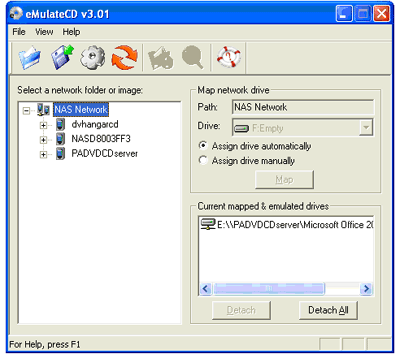 eMulateCD is a small but useful software tool that emulates network folders/images as local CD-ROM drives. It solves the problem that some CD titles need to be in local CD-ROM drives for execution, i.e., cannot run normally across network. You can also use eMulateCD to map and emulate several network drives at the same time.
