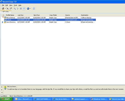 To use Second Copy, simply create profiles for files you want to copy to another directory, folder, drive or computer across the network. Each profile defines a source location, a destination location and how often the files should be copied.